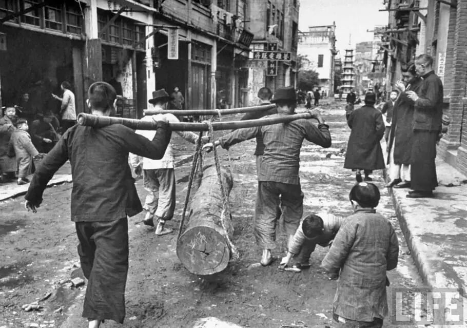 1949年3月,广州,抬木料。卡尔·迈当斯/摄。