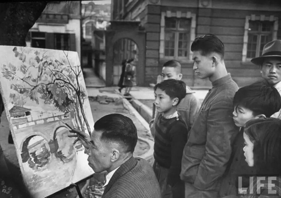 1949年3月,广州,街上行人围观一个画师作画。卡尔·迈当斯/摄。