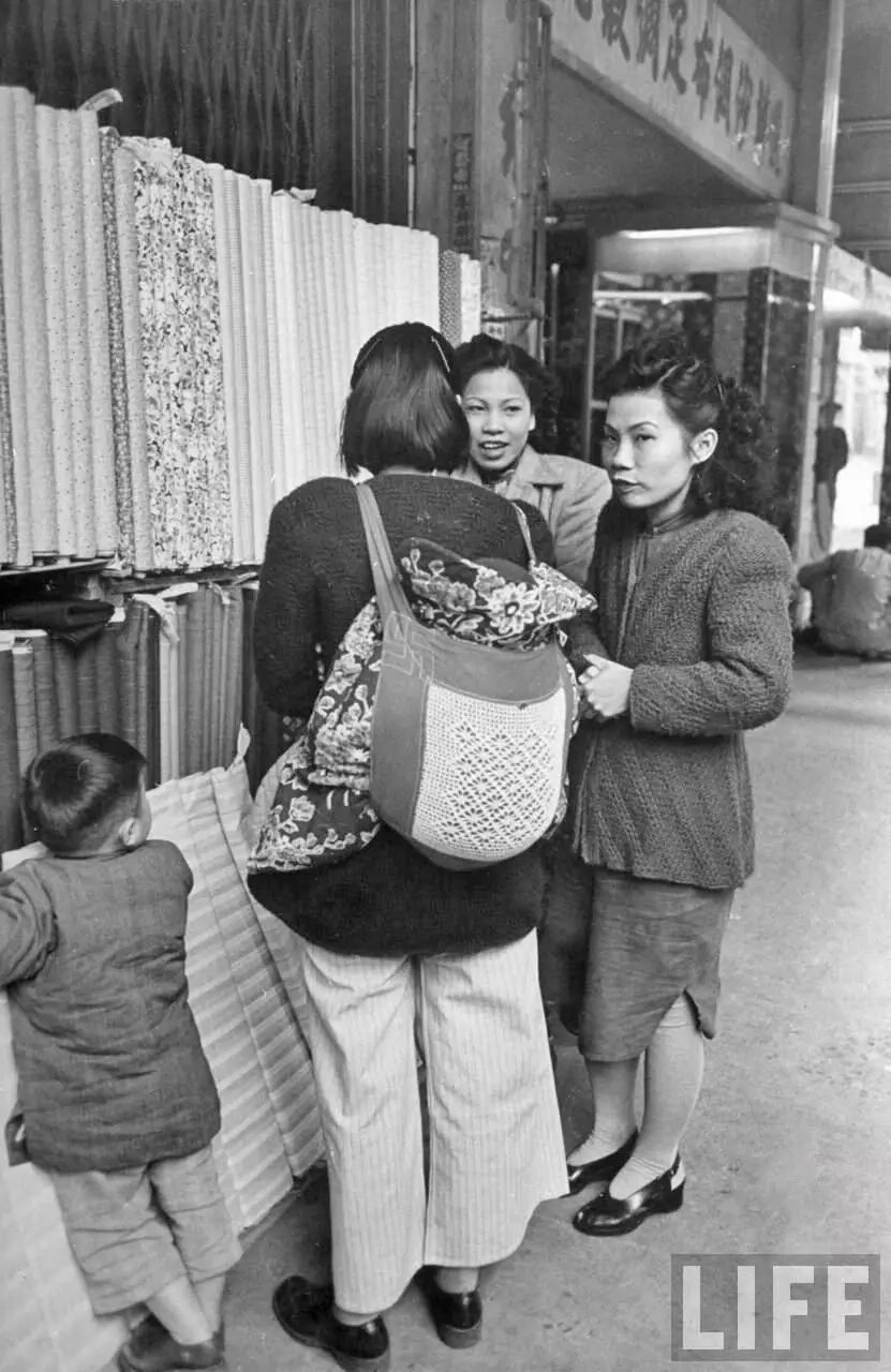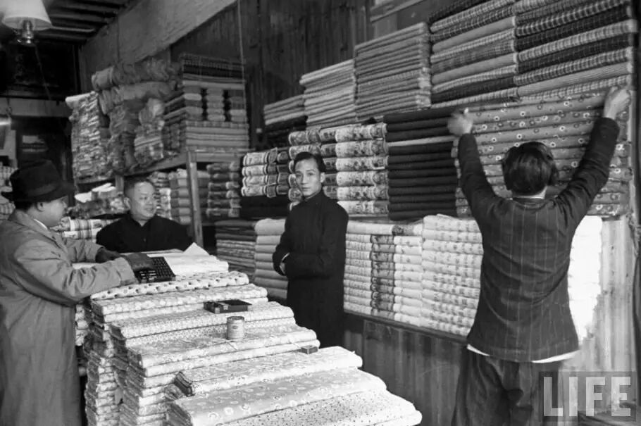 1949年3月,广州,布摊前的顾客。卡尔·迈当斯/摄。