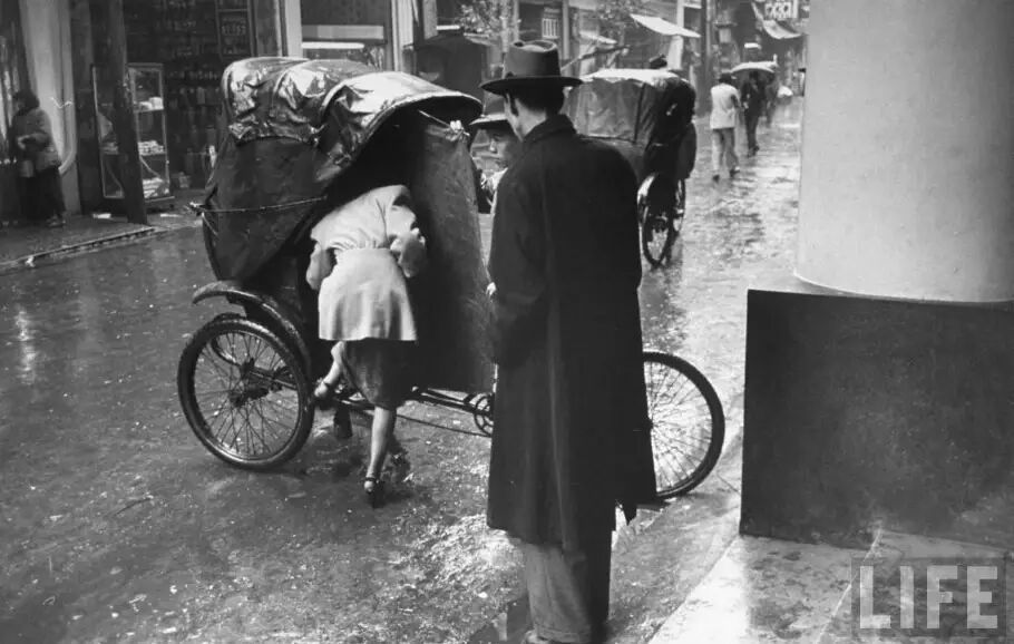 1949年3月,广州西河街,一个女人坐上黄包车。卡尔·迈当斯/摄。