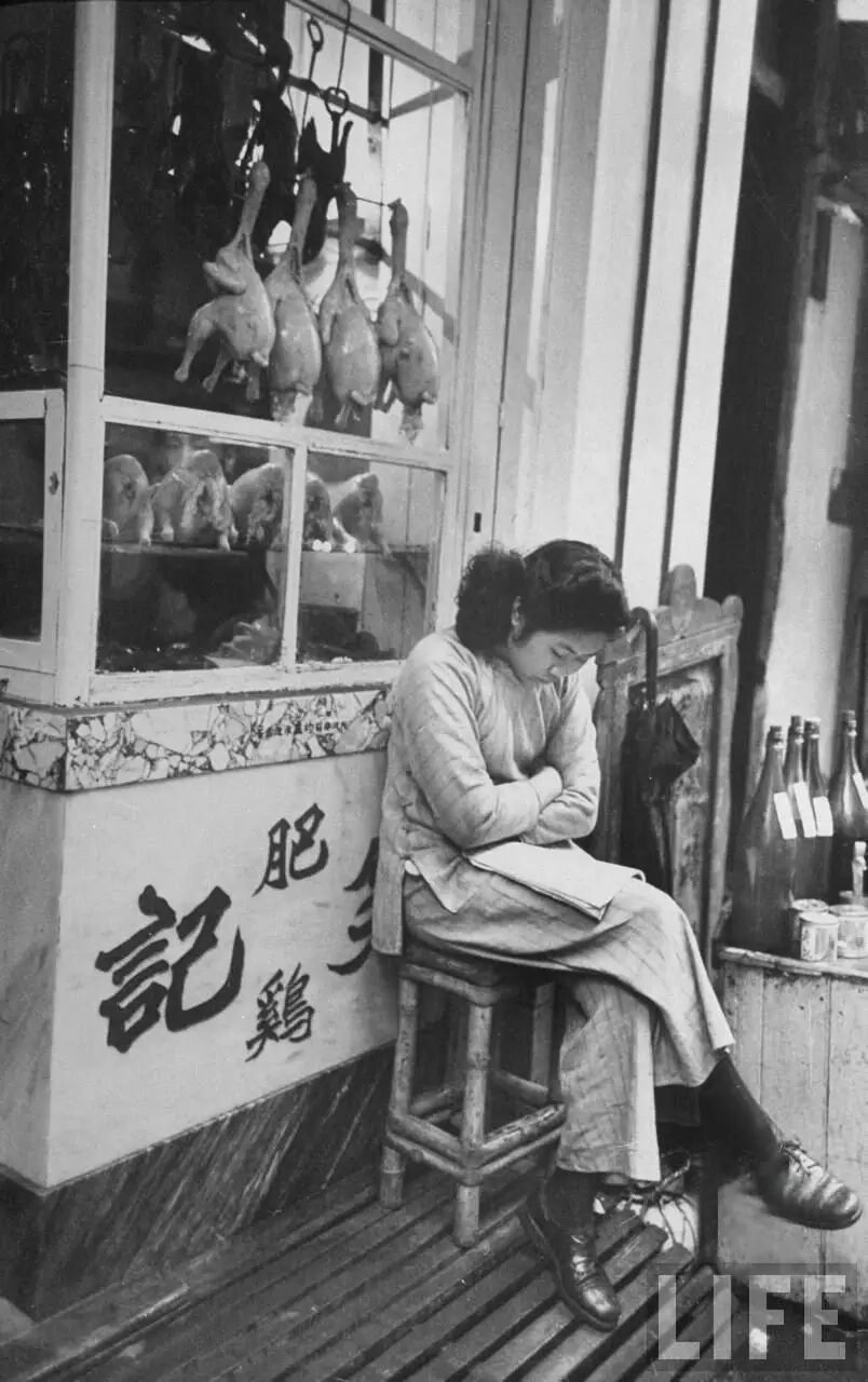 1949年3月,广州, 一个女子坐在肥鹅店前看杂志。 卡尔·迈当斯/摄。