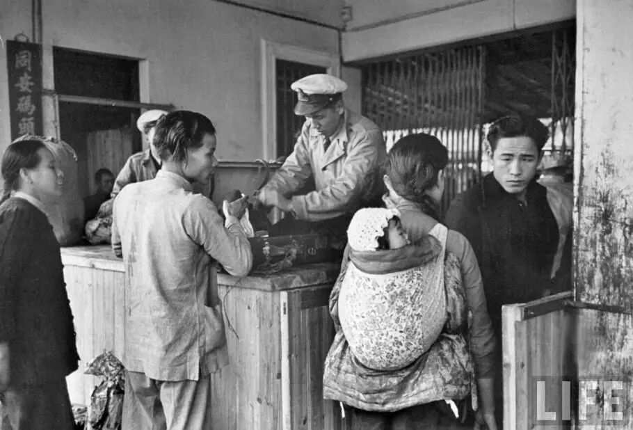 1949年3月,广州,国军军警检查旅客的行李。卡尔·迈当斯/摄。