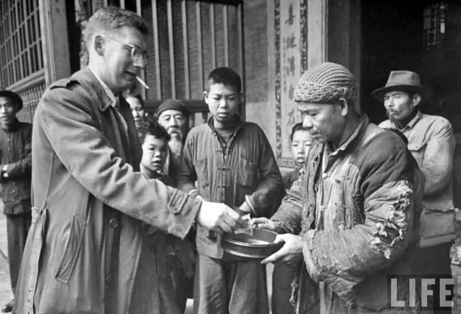 1949年3月,广州,一位外国人士拿钱给乞丐。卡尔·迈当斯/摄。