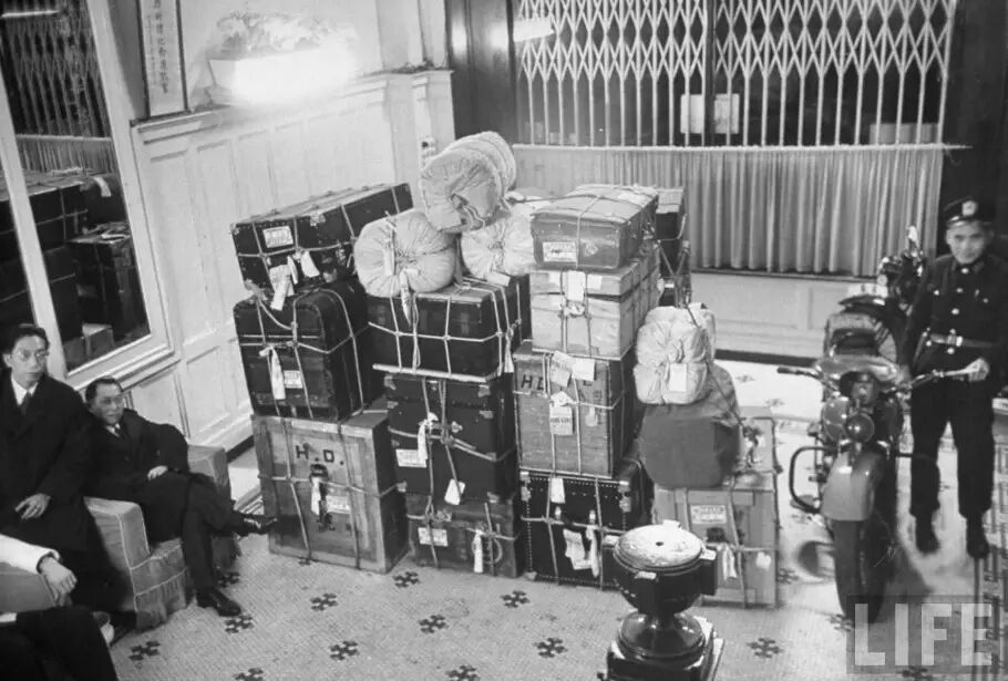 1949年3月,广州,一家酒店大堂里的旅客行李。卡尔·迈当斯/摄。