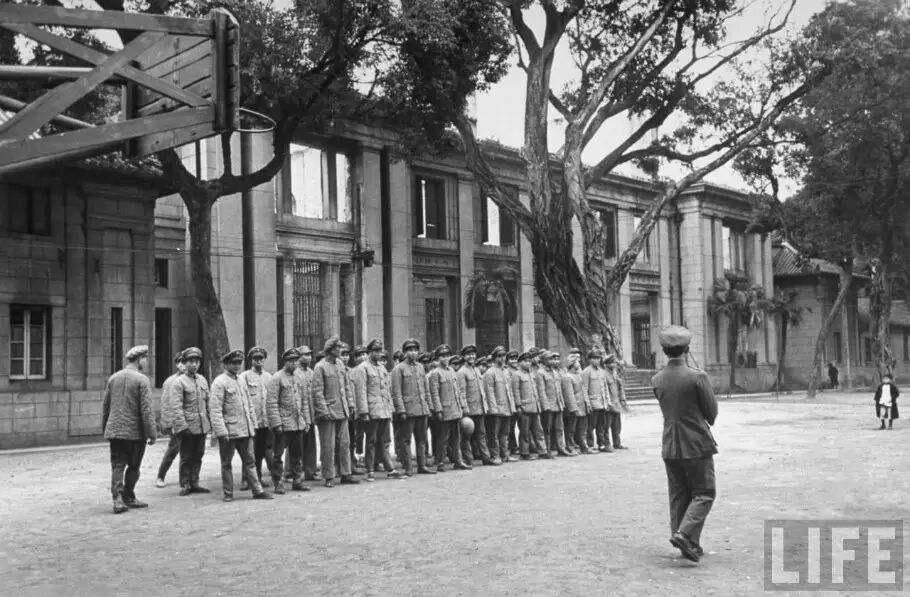 1949年3月,广州, 国军士兵列队站在广州英国领事馆前,该领事馆于1948年被群众抗议示威游行时破坏。卡尔·迈当斯/摄。