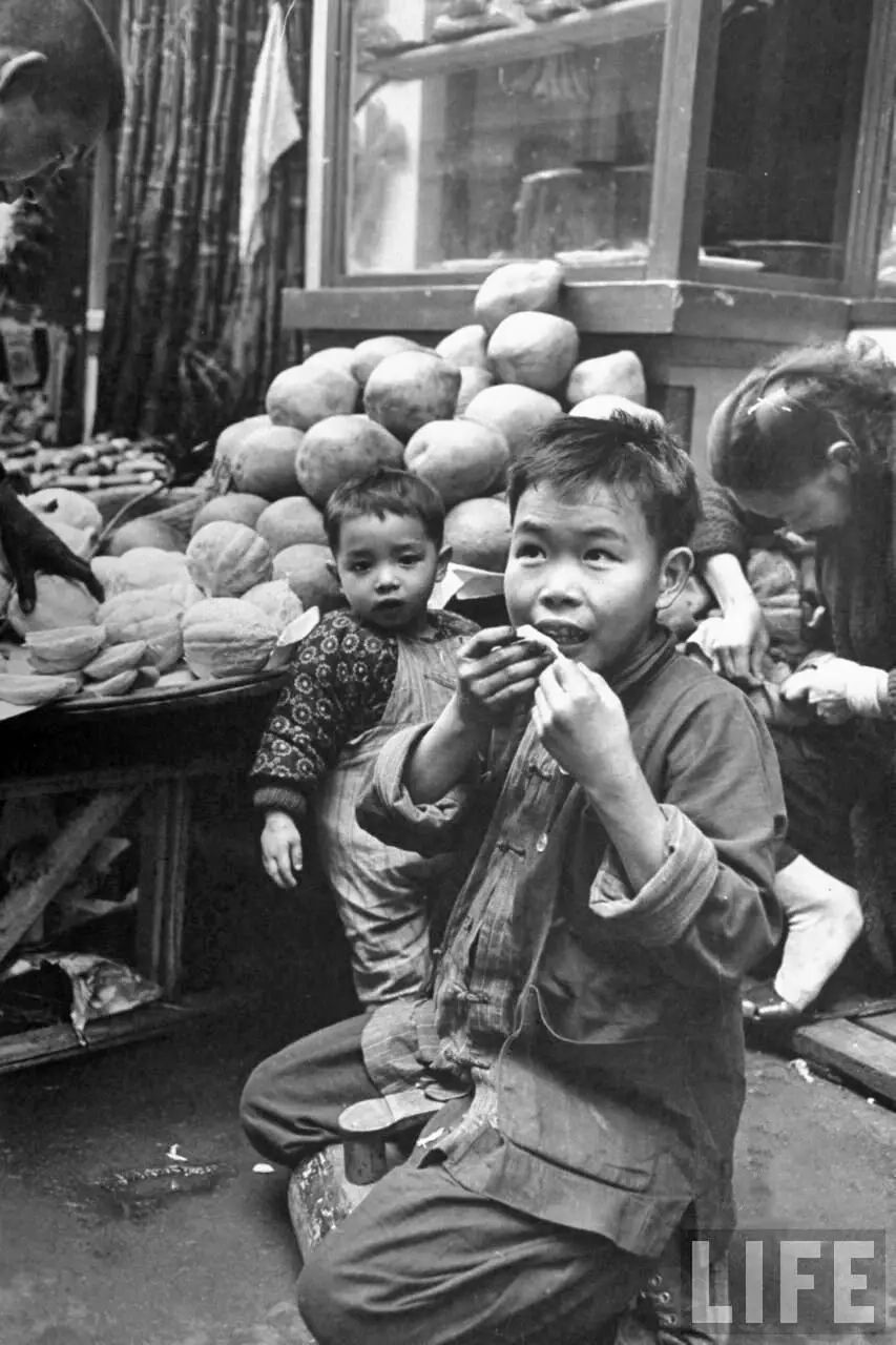 1949年3月,广州,一个水果摊旁边的擦鞋男孩。卡尔·迈当斯/摄。