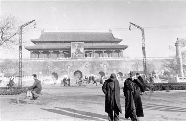 1946年,北平天安门前,两名国民党军人在暖阳下信步。国共两军在中原地区发生武装冲突,内战乌云逐渐笼罩全国,不过北平市内尚显平静。