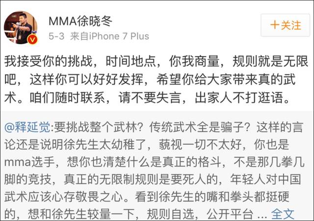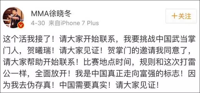 根据徐晓冬最新的微博,徐晓冬将接受部分武林人士的宣战,某些第三方金主还将给出120万奖金。