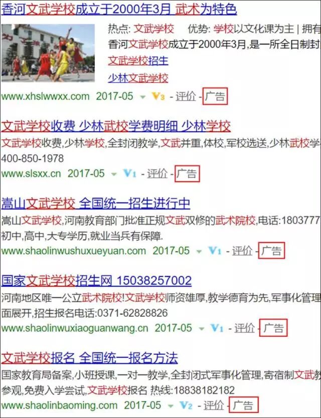 目前,国内有很多武传统武术学校,它们多以营利为目的。百度一下,这些文武学校的广告在百度竞价排名上一争高下: