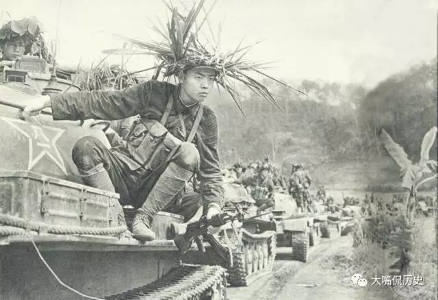 步兵搭乘坦克向越南境内开进。