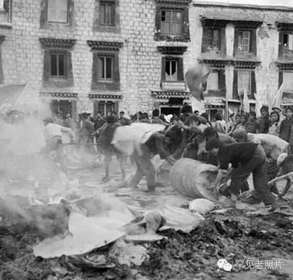这是大昭寺的讲经场“松却绕瓦”,红卫兵把存放在寺院里的佛教典籍化为灰烬,把一个很大的轱辘似装有许多经文的嘛尼轮(属于藏传佛教的象征物之一)推向大火焚烧。