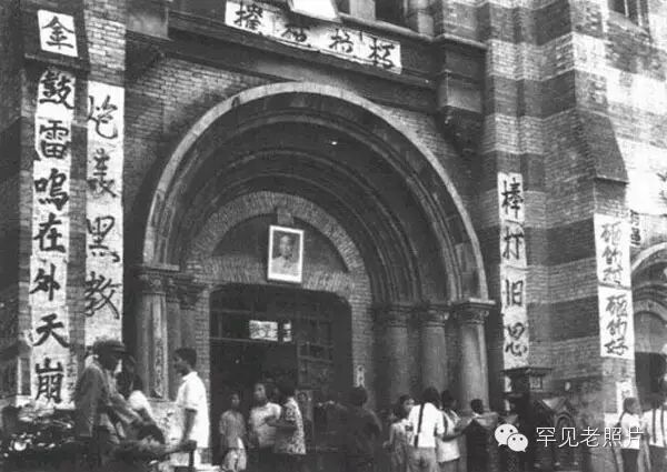 涂鸦天津西开天主教堂大门,最右边的标语“砸的对,砸的好”,大门两边对联“棒打旧思想,炮轰黑教堂”。