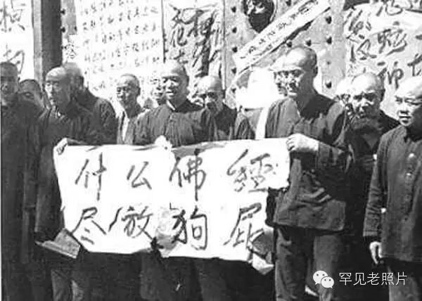 关闭寺院,批斗、侮辱和尚,门上对联“狼狈为奸王八蛋,死心塌地当狗才”,横批“坚决铲除”。
