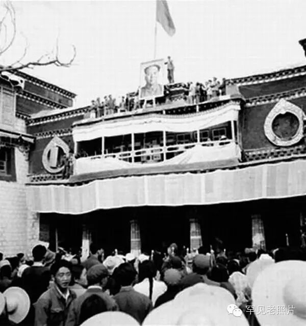 这是拉萨大昭寺的正面,所有象征宗教涵义的建筑装饰都被红卫兵破坏,安放了毛泽东的巨幅画像和五星红旗。