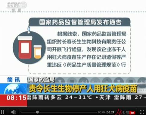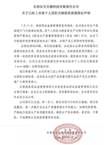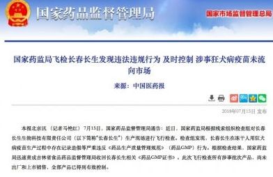 7月15日,国家药监总局在官网对制药企业长春长生生产记录造假的"冻干人用狂犬病疫苗"进行了通报,这成为了此次疫苗事件的开端。