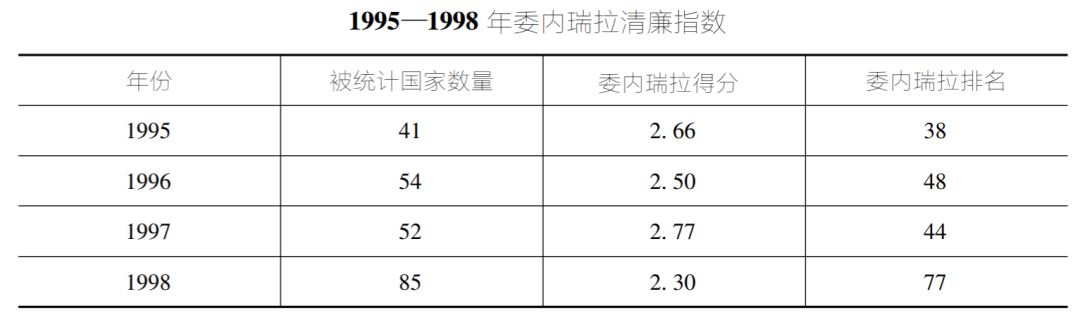 下表是“菲霍角体制”最后四年(1999年查韦斯上台),透明国际对委内瑞纳政治腐败的排名。