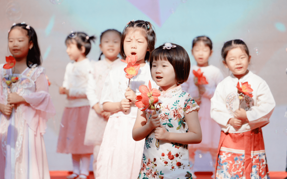 9点30分,庆典正式开始。幼儿园的孩子们身穿盛装,共同唱起了新创作的园歌《木棉絮》,温暖的旋律与歌词处处颂扬着师生间的深厚情感。紧接着,由两位调任男园长作为领头,共同敲响鼓声,开启了《二十四节令鼓》节目的序幕。幼儿园的孩子们精神抖擞,与男园长一起敲响了整齐的鼓声,一下子点燃了现场的气氛。