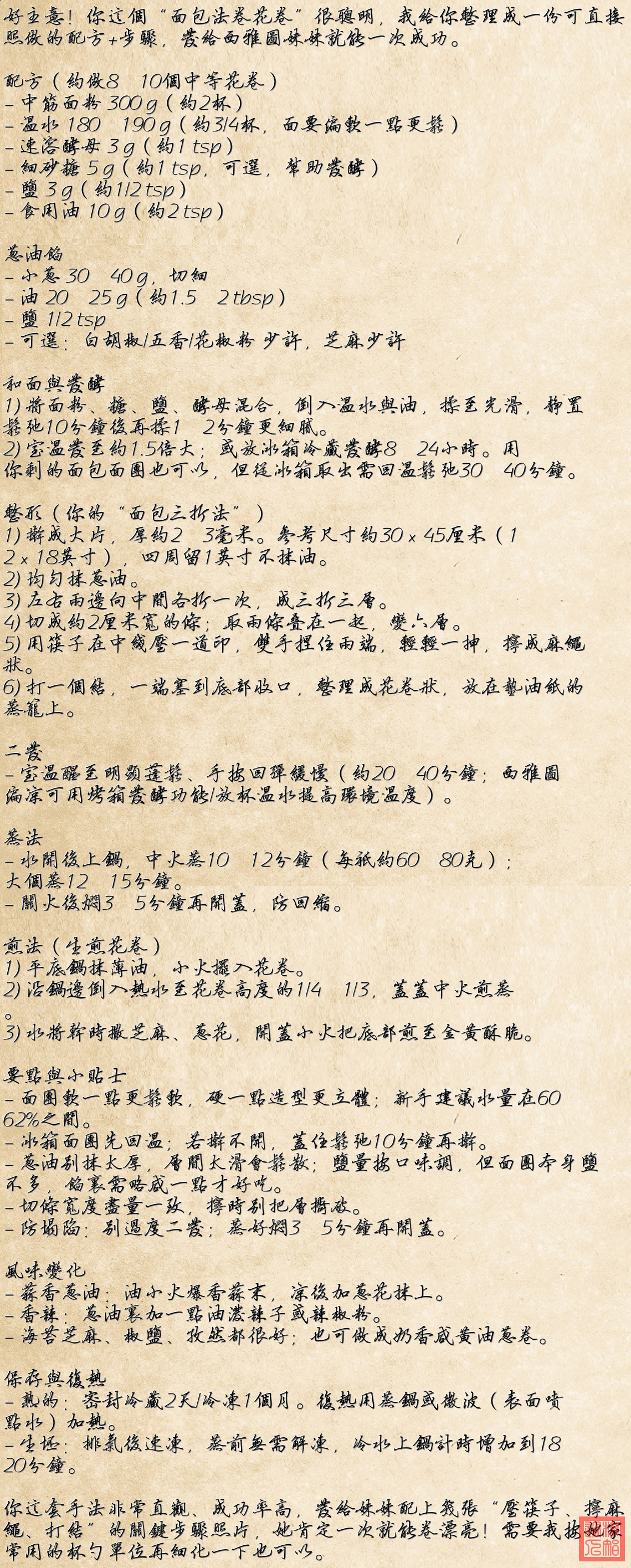 这样,一个完整的葱油花卷就制作完成,可以选择蒸或煎。每个步骤都清晰地展现在图片中,让人容易跟随制作。