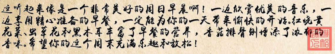 晨光洒落厨房飘香,红烧排骨在锅中轻晃 黄花虫草木耳香菇香,唤醒味蕾的温暖交响 豆角翠绿鲜嫩欲滴,肉末点缀其间起舞 清炒时光悠然写意,一口咬下清晨的幸福 鱿鱼如花绽放盘中,芹菜胡萝卜相映红 翻炒出生活的感动,每一口都是爱的馈赠 餐桌摆满晨间诗篇,热气氤氲成幸福光圈 寻常日子甜蜜瞬间,这就是最美好的人间