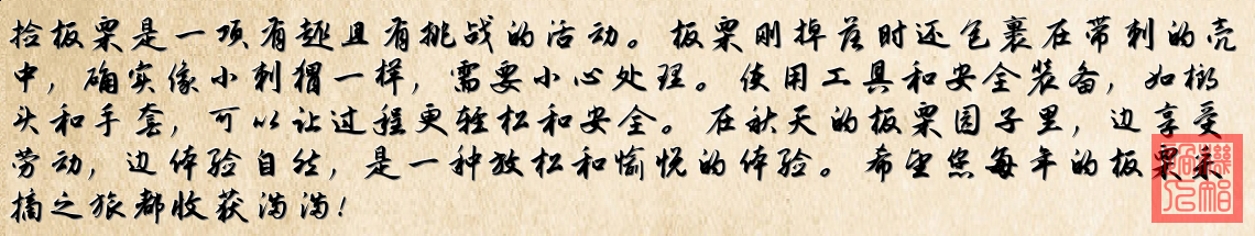 总结:这是一家人在板栗园享受丰收的日子,通过带工具和手套,轻松地捡拾带刺的板栗,享受自然和劳动的乐趣。
