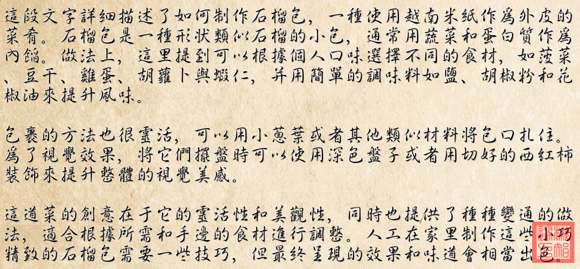 这些图片展示了一道以越南米纸为外皮的美食“石榴包”。