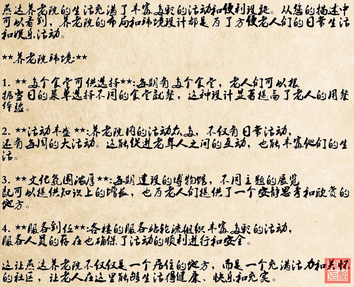 这些图文描述展现了燕达养老院注重提供多样化的生活和文化体验,以提高老人们的生活质量。