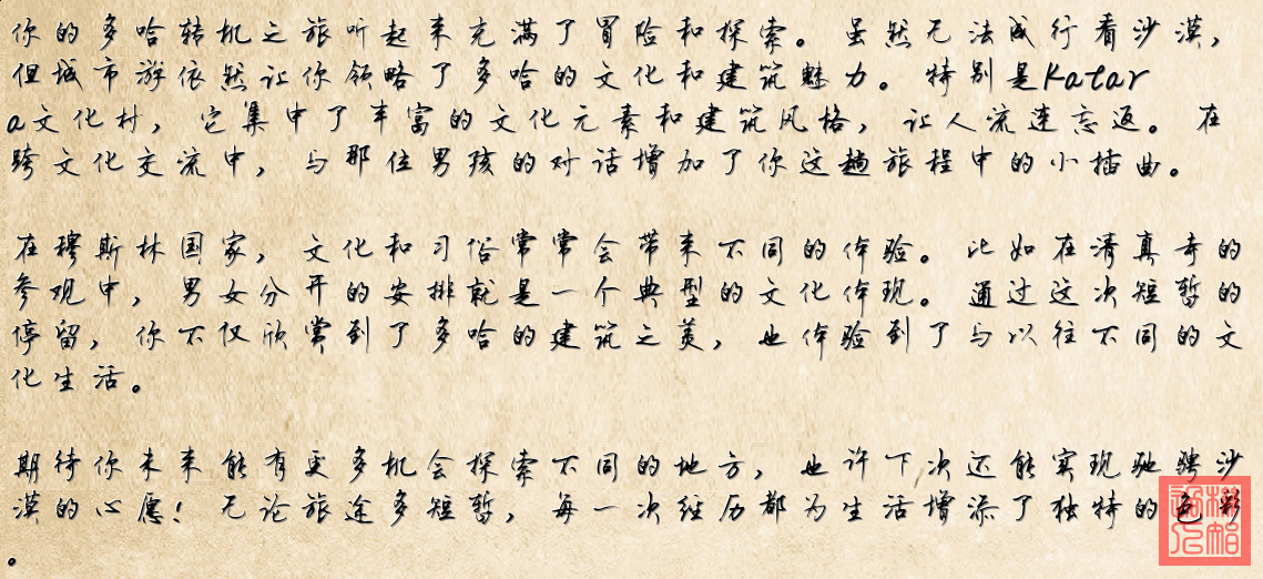 **综上所述**,这些图片反映了多哈这座城市现代与传统的交融景象,展现了其丰富多样的文化和艺术氛围。这些信息配合文字描述,提供了有关在多哈短暂停留的旅游体验的深入见解。