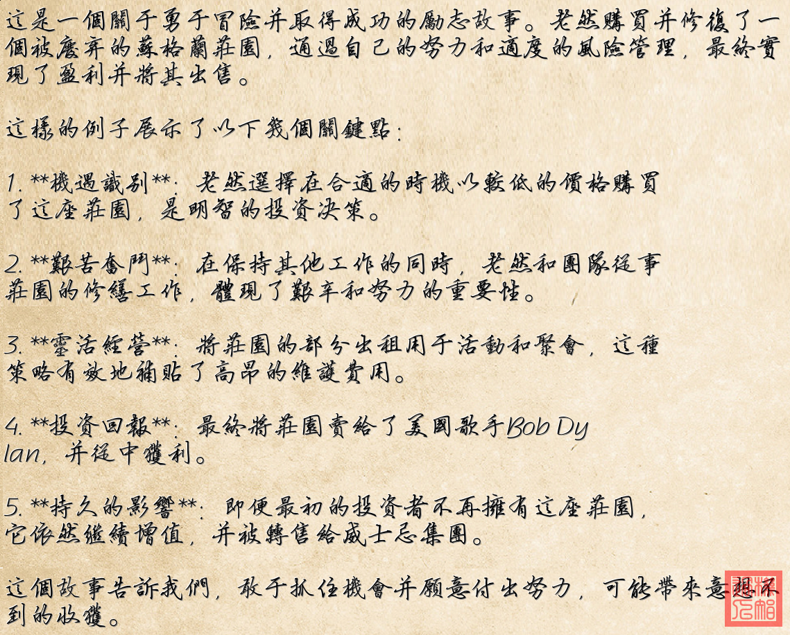 《老然的庄园》 晨雾漫过苏格兰高地 石墙上爬满时光印记 四个角楼守望着荒地 二十英亩沉睡的秘密 水箱倾泻在午夜时分 霉斑在壁纸上开成花 拍卖行的旧椅子不说话 陪着楼梯等春秋冬夏 刷墙的手掌沾满星光 园艺剪修过破晓黎明 婚礼的欢笑穿过长廊 租约里攒下新的钉钉 六年风雨砌成台阶 电线和水箱留在歌里 美国诗人推开门扉 留下所有斑驳的美丽 威士忌商人接过钥匙 价格翻涌成新的传奇 而老然站在时光对面 笑着那些冒险的年纪 当荒芜遇见勇敢的手 腐朽也能酿成酒 只要敢在废墟里种梦 石头也会开出玫瑰丛