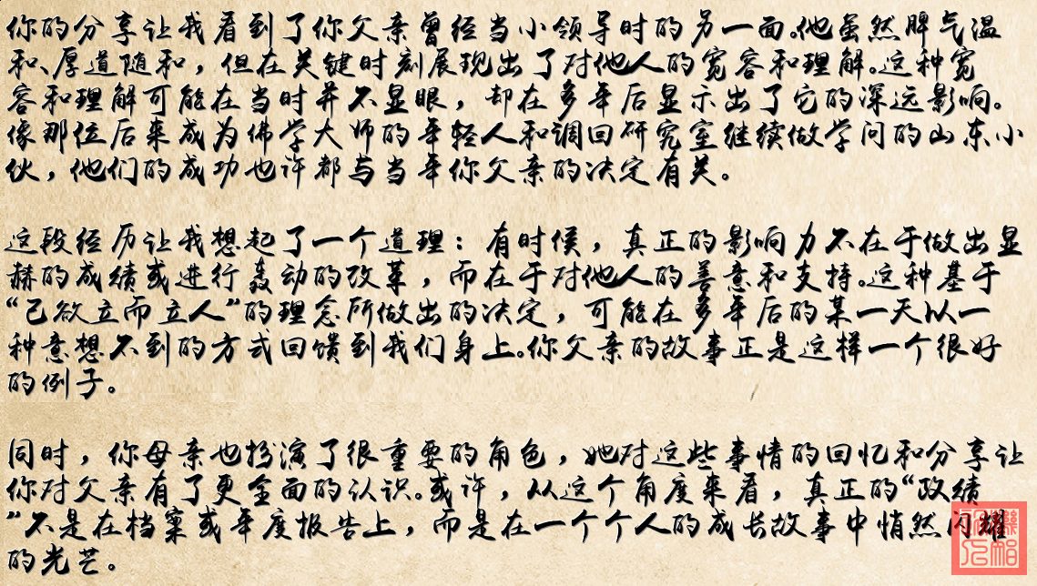 《时间的种子》 那年办公楼前梧桐飘絮 五四的横幅在风里翻飞 有人把喇叭塞进陌生手心 青春就突然有了回音 录像带转动着黑白光阴 谁在人群里辨认年轻身影 宽容是道未写完的填空题 多年后长出菩提树影 梵文经卷里藏着旧时叮咛 研究室灯光记得当年约定 原来每个看似寻常的决定 都是投向未来的浮瓶 岁月是条缓慢流淌的河 善意的石子要多年才能沉底 当央视演播室亮起灯光 才懂得清水衙门里藏着的天意 那些被时光打磨的因果 在某个清晨突然结果 就像父亲留在档案室的签名 终在别人生命里开成了花朵
