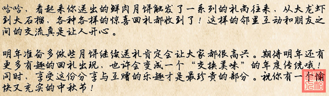 《礼尚往来》 红彤彤的龙虾摆满桌 金黄月饼飘香过中秋 竹篮里石榴咧嘴笑 自家种的甜蜜送亲友 麻花酥脆卷成金圈圈 五仁馅料裹着老传统 你来我往情意绵绵 礼盒装满暖暖的问候 明年要包更多香甜 让每扇窗都透出笑脸 厨房飘起幸福炊烟 等着收获双倍的欢颜 礼物流转像月儿圆 情分在街坊邻里绵延 这份期待甜过蜜糖 哈哈哈 笑声飞上天