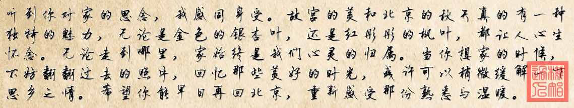 《银杏来信》 风绕过红墙低语 落叶在脚边写满金色诗句 光影斑驳的长椅 收藏着未寄出的絮语 仰望树梢的间隙 天空被染成思念的质地 飘零旋转的轨迹 是秋天特有的信纸 每片落叶都藏着年轮印记 铺成通往记忆的阶梯 当斜阳浸透四合院飞檐 听见故乡在呼吸 踩碎满地的碎金 脚步声惊起沉睡的蝉衣 树影摇曳的涟漪 漫过青砖斑驳的背脊 深秋酿造的静谧 让漂泊有了温暖的容器 俯身拾起的叶片 脉络间尽是归期