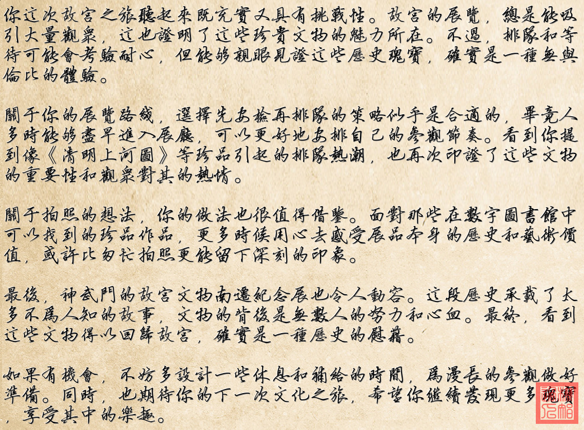 这篇游记提到了作者在10月11日参观故宫的经历,重点是两个展览:“故宫午门百年守护展”和“神武门故宫文物南迁纪念展”。作者详细描述了参观过程、队伍情况以及展览的内容。游记中提到的文物包括清明上河图、金瓯永固杯以及其他珍贵文物,这些艺术品让游客感受到其历史和文化价值。