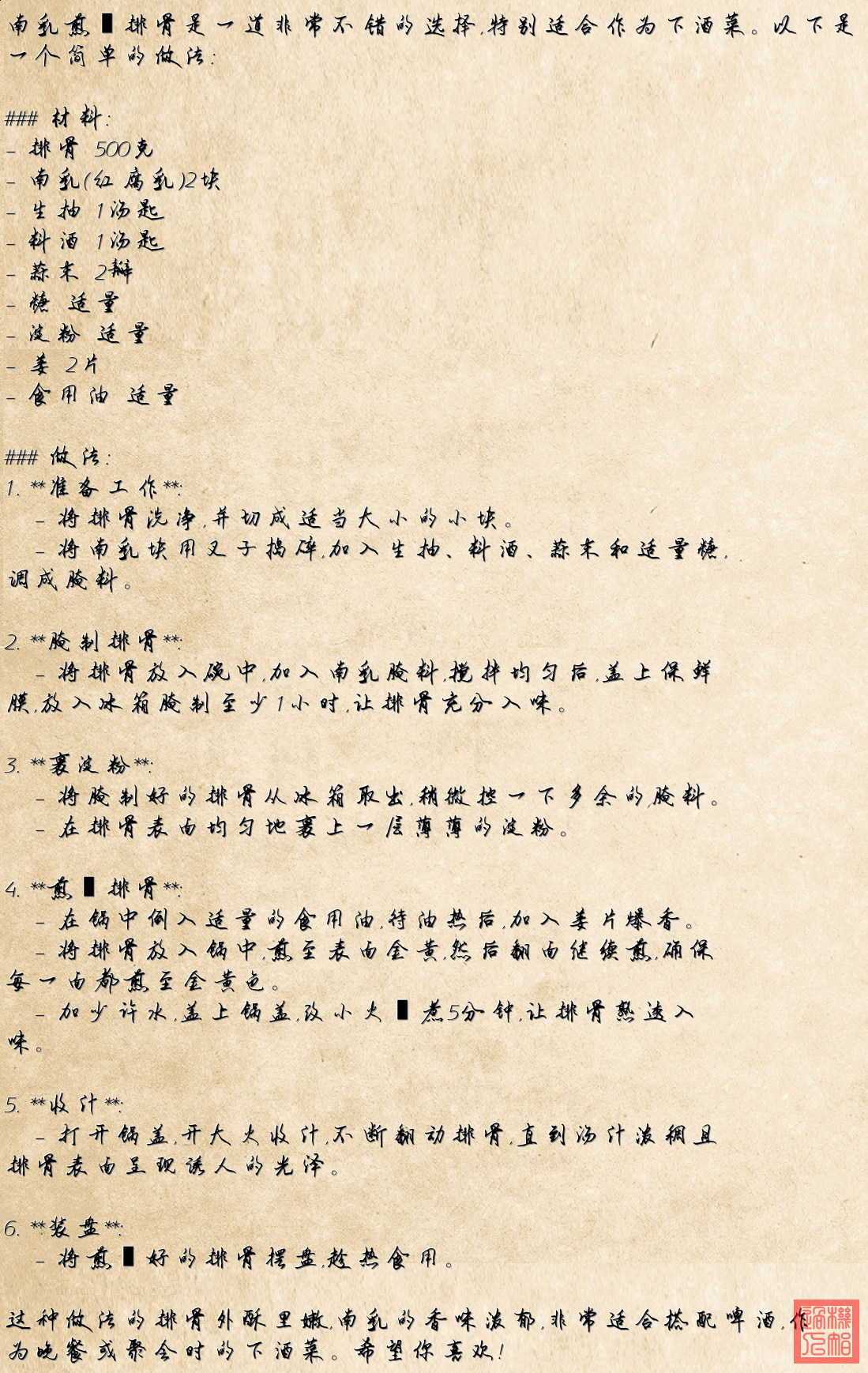 看起来这是一道南乳煎焗排骨。照片中可以看到切成小块的排骨,外表呈现出诱人的褐色,并伴有葱段等调料。这道菜看起来色泽红亮,应该是经过煎焗至熟,且有南乳的香味,通常是一道非常美味的下酒菜。