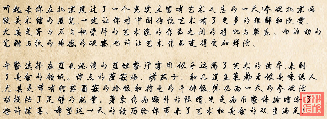《纸上行吟》 墨痕在宣纸上漫游 千年笔意穿过春秋 青藤白阳八大缶翁 三家门下明月如钩 牛排饭飘香的时候 菌菇汤里光阴停留 炭火炙烤着午后温柔 薯条金黄如银杏叶落满街头 二楼展厅光影浮动 看见纸的脉络在呼吸 枯笔扫过处山石清瘦 虾须颤动似水波轻皱 蓝蛙与蓝港的午后 艺术与生活在此邂逅 白石老人若回眸 定会笑说人间烟火最风流 墨色在舌尖化开 像未干透的云山烟霭 我们穿行于古今之间 带着满身星斗离开