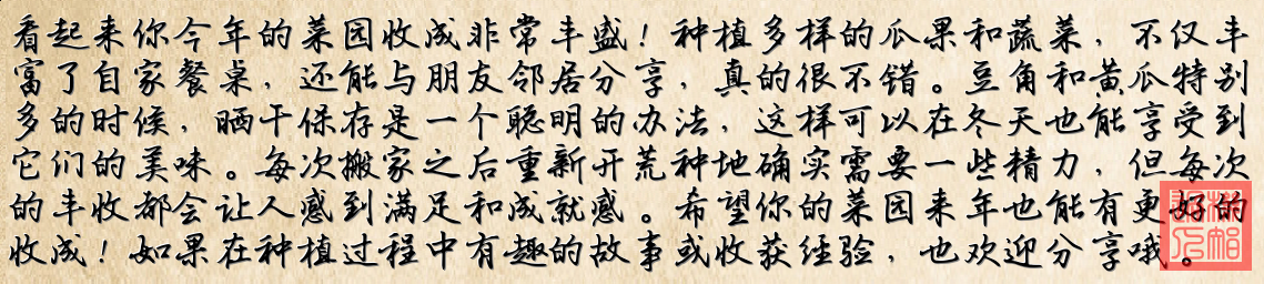 从这些图片和描述可以看出,今年的种植收获是丰盛的,尤其是豆角和黄瓜的产量非常高。