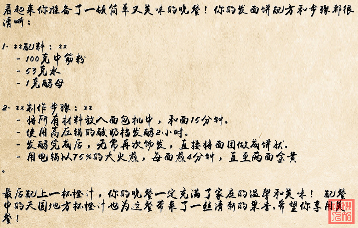 这种详细的制作和烹饪描述使得整过程看起来很容易复刻。如果你想尝试制作,可以严格按照这个配方和步骤进行。