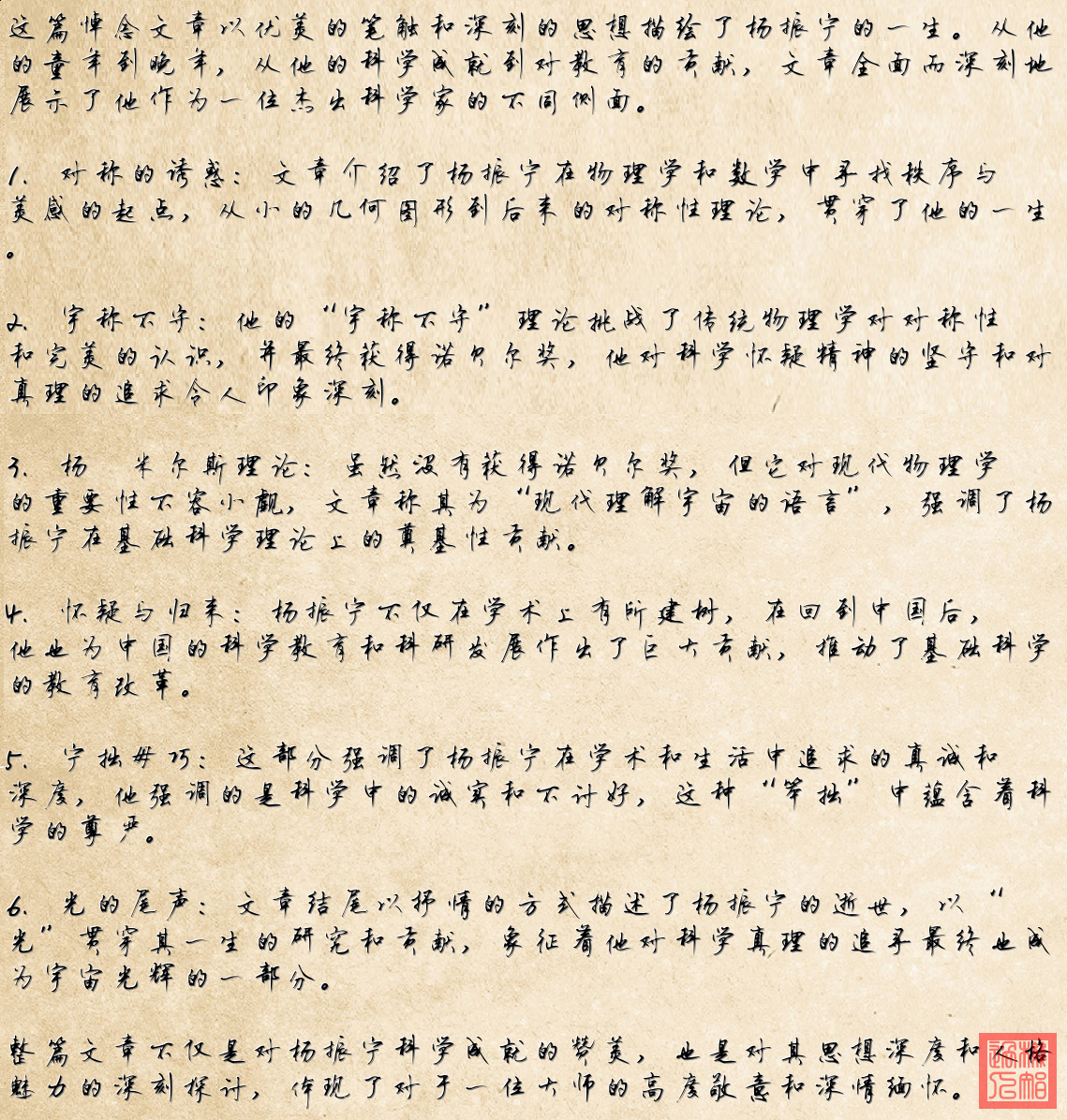 晨光穿过几何的窗棂 少年在纸上画下永恒 瓦砾堆里长出方程 雨季中听见真理的轰鸣 芝加哥风雪裹着星火 谁在质问完美的轮廓 数学的泉涌出自由 镜子背面藏着宇宙的缺口 左手与右手不再相认 破碎的镜像才是完整 奖章沉入时光河流 唯有怀疑在岸边长存 写给未来的诗太轻盈 规范场里藏着所有力 未完成的语法蔓延 等后人接续光的笔迹 归途携着思想的种子 在荒原种下对称裂隙 他说要拙不要取巧 像工匠刻下永恒印记 理性与诗意本是共轭 笨拙的深痕胜过浮名 他化作星图里一道光 在裂痕中写下无限接近