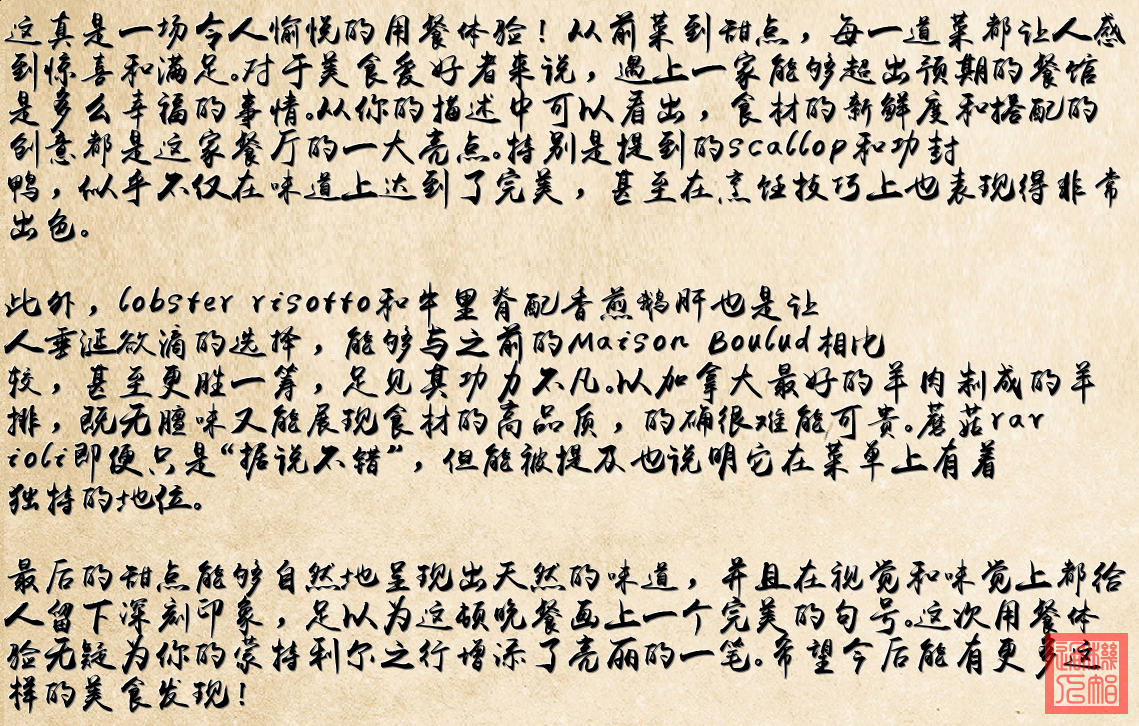 这次蒙特利尔之行的餐馆体验非常愉快,以下是详细的菜品介绍: