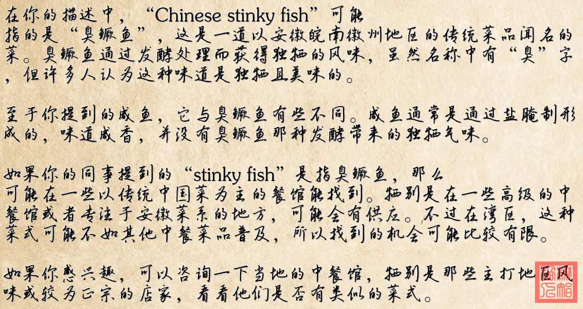 “Stinky fish” 在中文饮食中可能指的是“臭鳜鱼”或“霉干菜蒸鱼”等发酵类鱼产品,而不是简单的咸鱼。它们通过发酵产生特有的气味。