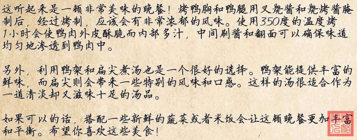 这是一道用鸭子制作的菜肴。可以看出,鸭胸和鸭腿被切片后,用叉烧酱和烧烤酱腌制。菜谱提到用350度烤一小时,中途刷酱并翻面。此外,鸭子的骨架和扁尖用来煮汤。看起来,这道菜金黄油亮,应该很美味。