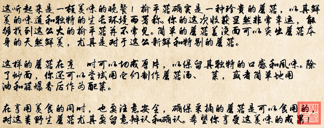 《林间珍味》 晨露未干踏青苔 老树新菇破木来 三朵云伞垂河畔 最大如掌迎风摆 竹篮轻摇沾草籽 溪水潺潺洗尘泥 刀落银盘白玉碎 满室飘散山野气 铁锅沸了清泉水 葱花点点缀鲜味 面条舒展如云卷 浇上林间珍馐美 暮色四合炊烟起 碗中盛满秋日意 偶然拾得自然赠 平凡日子藏惊喜