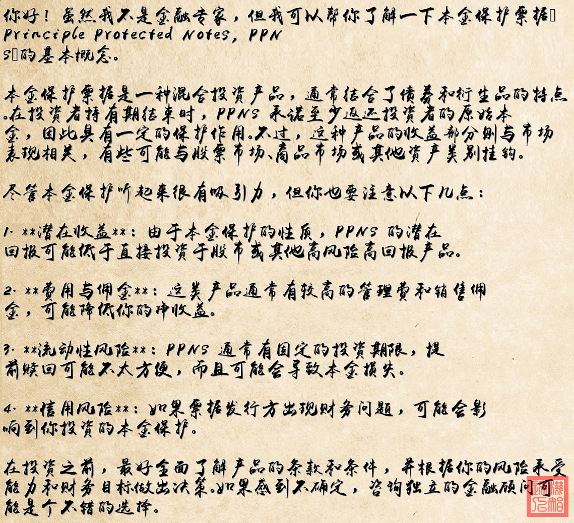 1. **投资建议:** 你提到一个金融顾问向你推荐了一种投资产品,即本金保障票据。这个产品通常承诺在投资到期时至少返还初始投资金额,并可能提供额外的收益。