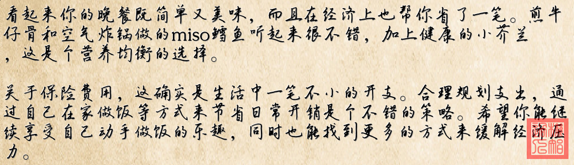 通过自制简单的晚餐,不仅节省开支,也能享受美味,非常不错!而且提到保险费用较高,因此选择在家吃饭更经济实惠。