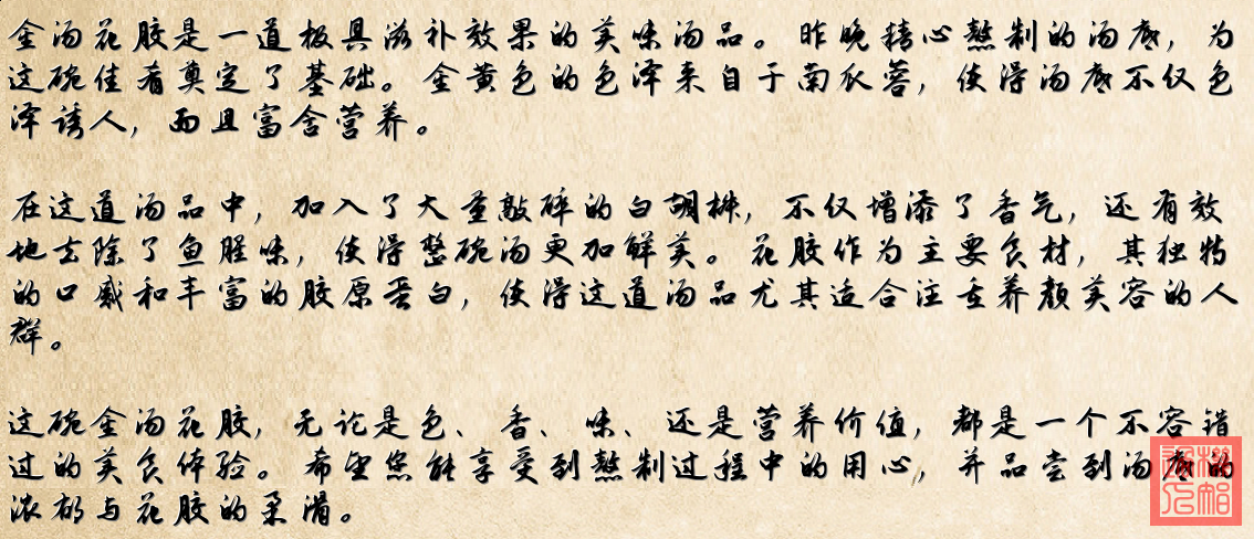 1. **金汤花胶**:第一张图片中的金汤花胶是用南瓜蓉制成的“金汤”搭配花胶。汤色鲜亮,点缀有切碎的葱花。