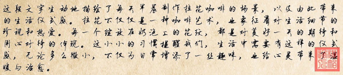 2. **拉花咖啡**:这是一杯精心制作的咖啡,上面有细腻的奶泡和心形图案的拉花。这张图突显了早晨咖啡的仪式感。