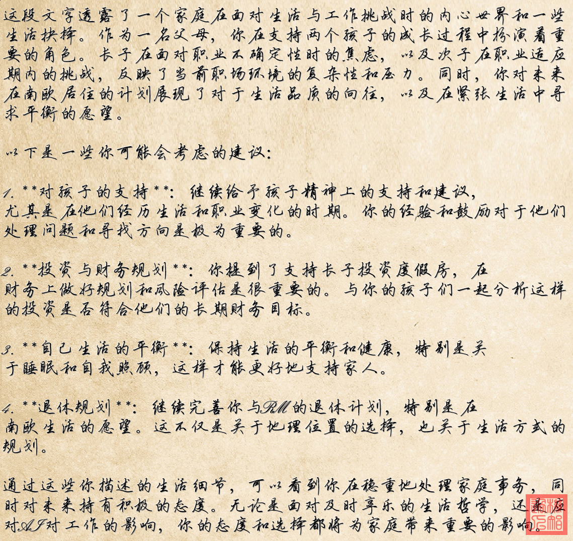 3. 家庭情况和未来计划:作者提到自己的两个孩子的工作和生活状态,老大的婚期推迟,以及想购买度假房用于Airbnb。老二则是刚参加工作不久,尚在适应中。