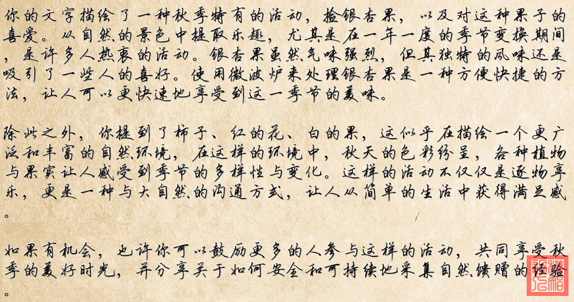 《秋日私语》 风起时枝头挂满金黄铃铛 弯腰拾起散落的时光 微波炉里蹦跳着白果香 谁说芬芳才算好时光 红浆果在绿叶间捉迷藏 橙柿子把甜蜜悄悄酝酿 那抹嫣红在晨露中绽放 白珍珠在枝头轻声歌唱 踩着落叶沙沙响 竹篮装满秋日私藏 酸甜苦涩都是馈赠 何必在意他人目光 霜染层林多绚烂 每颗果实都有故事讲 简单快乐就像此刻 捧着温热听风吟唱 酸甜苦涩都是馈赠 何必在意他人目光 简单快乐就像此刻 捧着温热听风吟唱