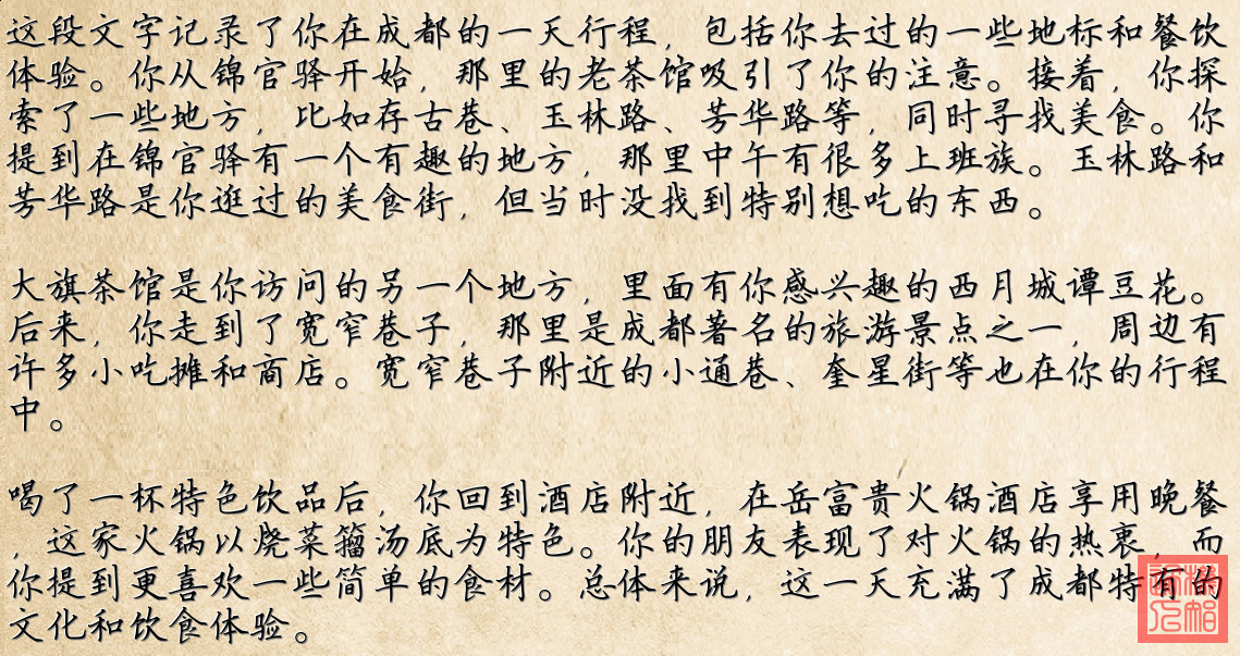 这组图片记录了一天的成都旅行经历,重点包括美食和茶馆文化。