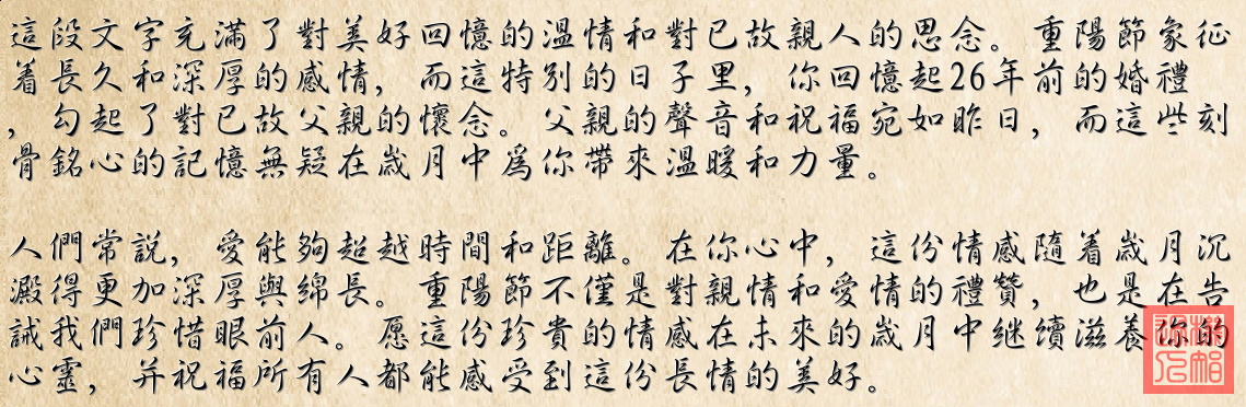 这些照片通过记录一个个细节,体现了婚礼的幸福与父母的祝福。这是一种对传统的重阳节和家庭情感的表达,蕴含着长久的爱意与思念。