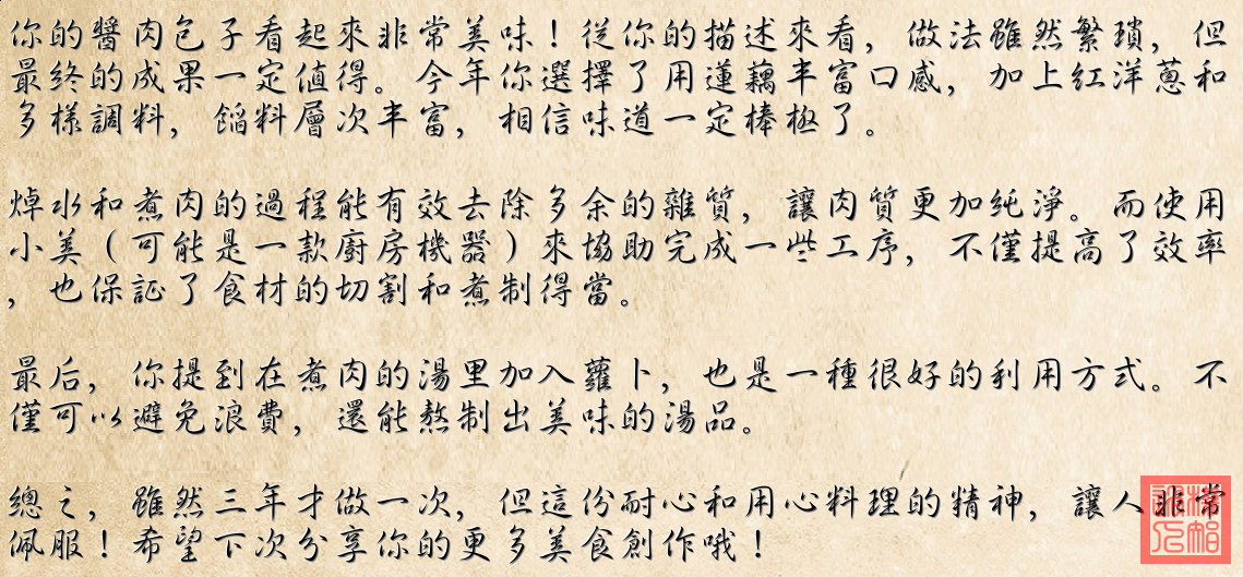 砧板响起笃笃声 肉块在清泉里翻腾 莲藕脆响添玲珑 面粉扬起白雾朦胧 红洋葱在锅里起舞 黄豆酱染透暮色 姜末点亮了晨露 老抽勾勒年轮斑驳 掌心托起白月光 捏出二十五个月亮 蒸笼飘出云朵香 炊烟系着家的方向 掰开金黄夕阳 肉香漫过青瓷碗 萝卜汤清浅荡漾 暖意留在唇边打转 岁月炖煮的时光 都包进这弯弯褶皱 每道皱纹里藏着 生活温暖的合奏